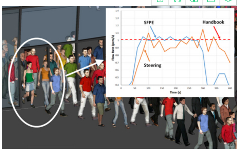 -除了3D模擬視圖,Pathfinder還提供了2D時間關系曲線圖的CSV文件和記錄樓層疏散時間和出入口流通率的文本文件。